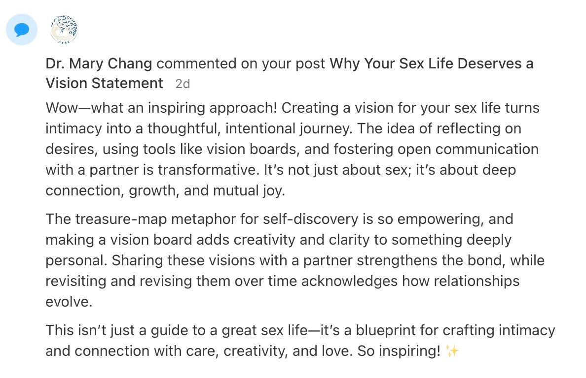 This newsletter exists to guide and inspire people like you - those who may be feeling stuck, uninspired, or ready to redefine what pleasure can mean. I’m here to show you that it’s never too late to reconnect with yourself and embrace the powerful, pleasurable possibilities within.